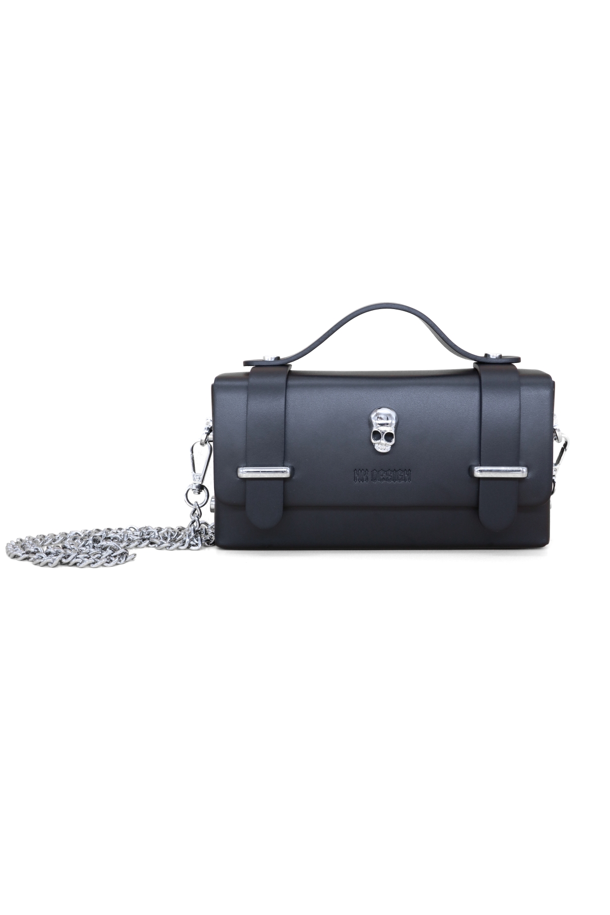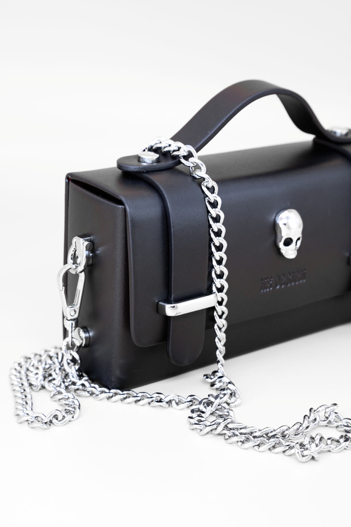 Leather handbag with a removable silver-tone metal shoulder strap and red interior. Single compartment with flap closure. Length of leather strap: 118 cm Dimensions: 19x11x6 cm Shipping Europa: 4/5 workyng days International shipping: 6/10 workyng days Borsa a mano in pelle dotata di 1 tracolla rimovibile in metallo argentato, con…