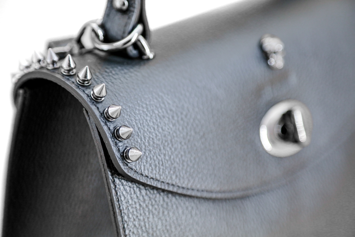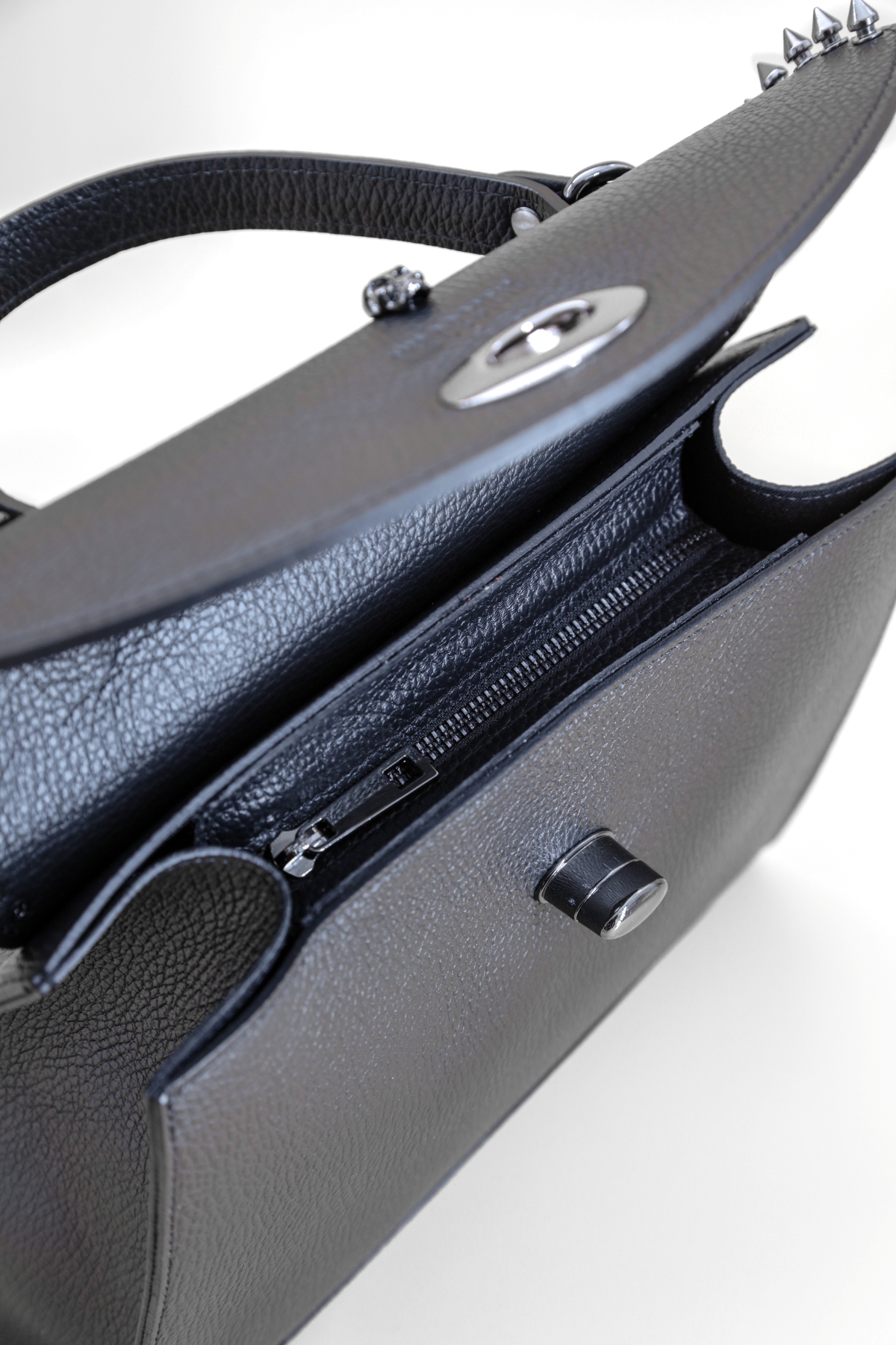 Leather hand bag with detachable and adjustable shoulder strap. Single compartment plus internal zip pocket.Equipped with an internal zip closure and an external turn-lock closure. Bottom with metal feet.